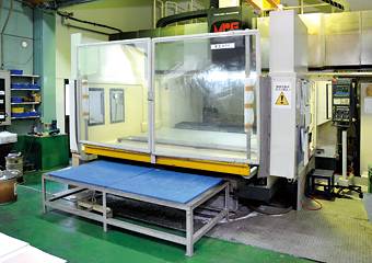 | 3,000mmのフッ素樹脂製部品の切削を可能にする大型門型加工機。大型対応だけでなく、800mmの部品を3セット同時加工するなど、本来のスペックを活かしながら機械を使い切る創意工夫で、さらなる品質・生産性の向上に貢献。大型加工機が魅せる可能性は時間さえも価値にします。 |